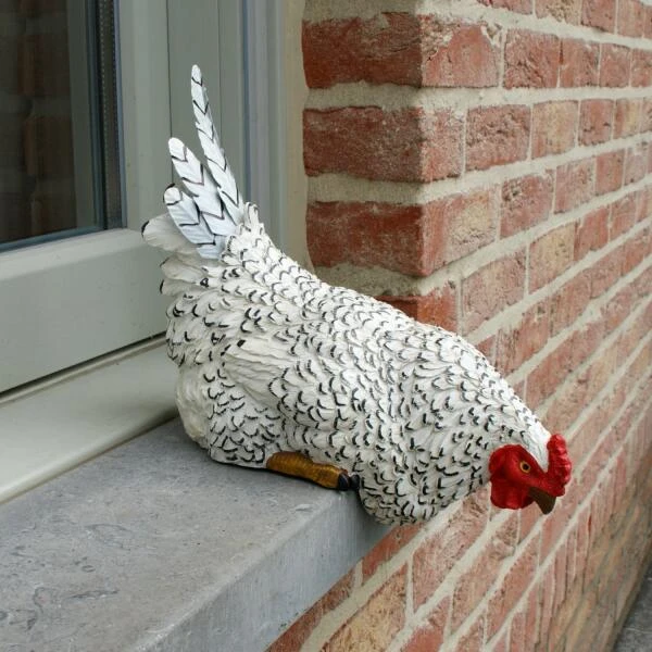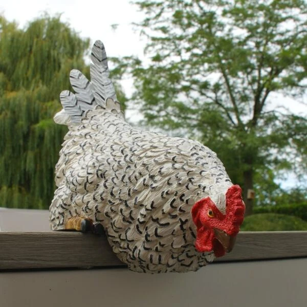 Deze nieuwsgierige kip gluurt als het ware over de rand van jouw tuinmuur, kippenren, tuintafel of keukenkast. Het wit verenkleed met zwarte accenten, de rode kop en unieke vorm maken van deze kip een origineel beeld.